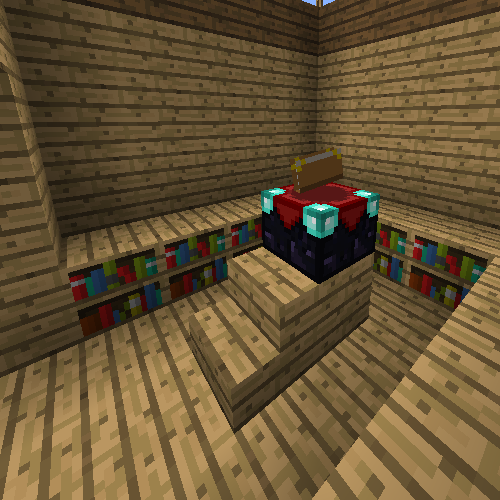 エンチャントテーブルは設置してすぐに道具にエンチャントを付与することができますが、エンチャントテーブルの周囲を1ブロック空けて本棚を周囲に置くとエンチャントレベルを上げることができ強力なエンチャントが出やすくなります。